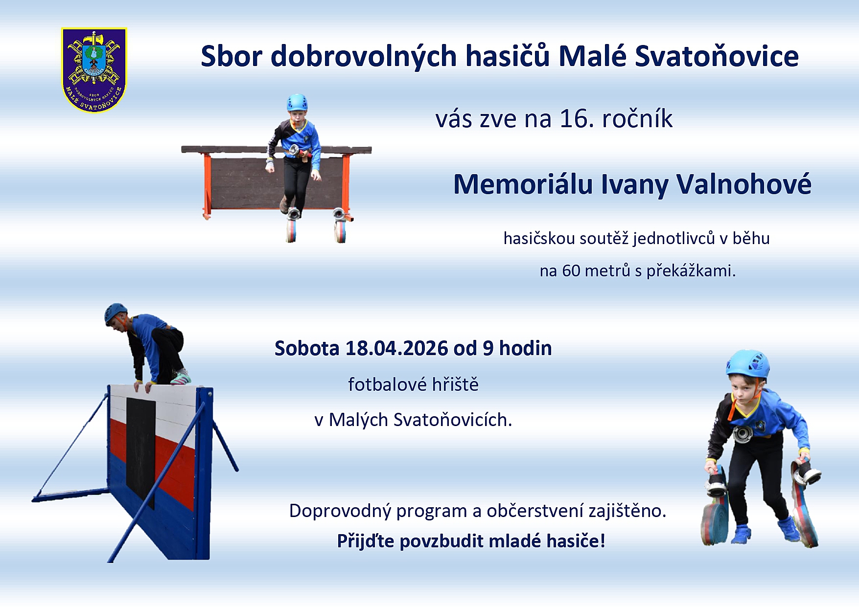 Sbor dobrovolných hasičů Malé Svatoňovice vás srdečně zve na 16. ročník Memoriálu Ivany Valnohové, který se uskuteční v sobotu 18. dubna 2026 od 9:00 hodin na fotbalovém hřišti v Malých Svatoňovicích.