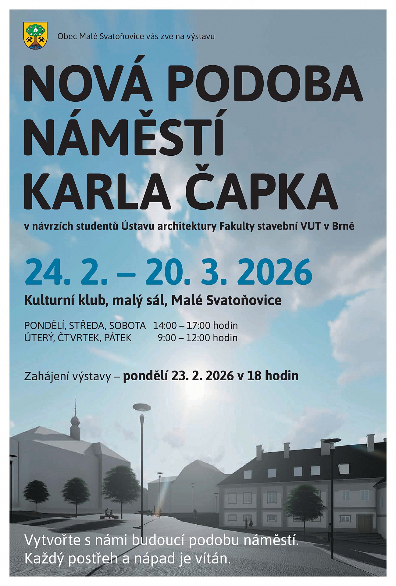 Obec Malé Svatoňovice vás zve na výstavu Nová podoba náměstí Karla Čapka, kde uvidíte odvážné i praktické návrhy studentů architektury z VUT v Brně.
