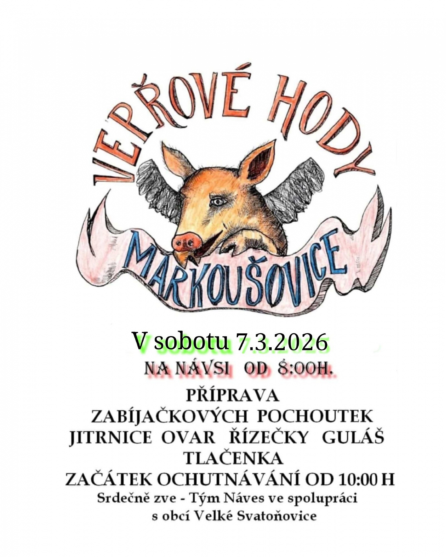 V Markoušovicích se chystají tradiční Vepřové hody. Na návsi proběhne příprava i ochutnávka klasických zabijačkových pochoutek, jako jsou jitrnice, ovar, řízečky, guláš či tlačenka. Na akci srdečně zve Tým Náves ve spolupráci s obcí Velké Svatoňovice.