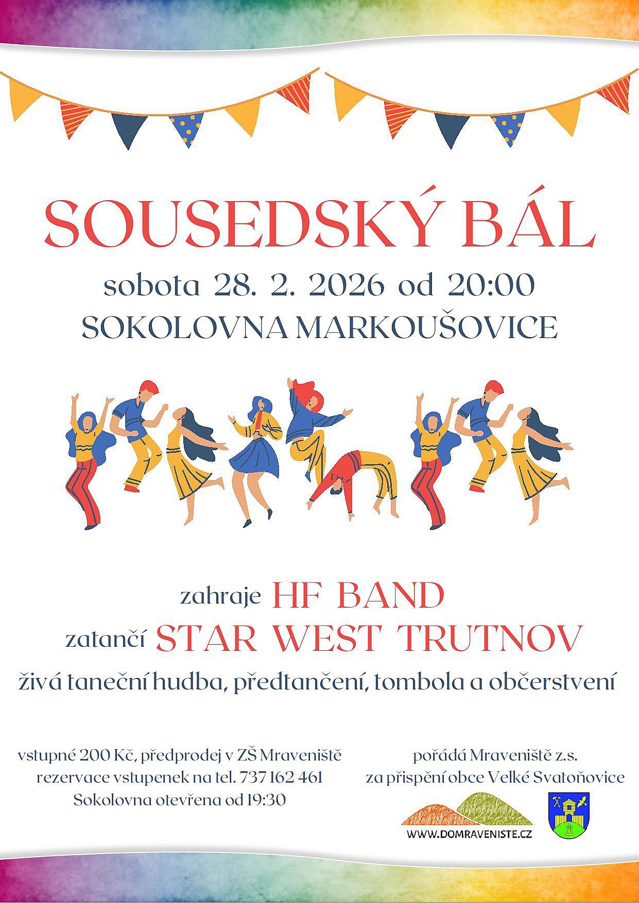 Spolek Mraveniště z.s., za přispění obce Velké Svatoňovice, srdečně zve všechny příznivce tance a dobré zábavy na tradiční Sousedský bál. Akce se uskuteční v sobotu 28. 2. 2026 v prostorách sokolovny v Markoušovicích.