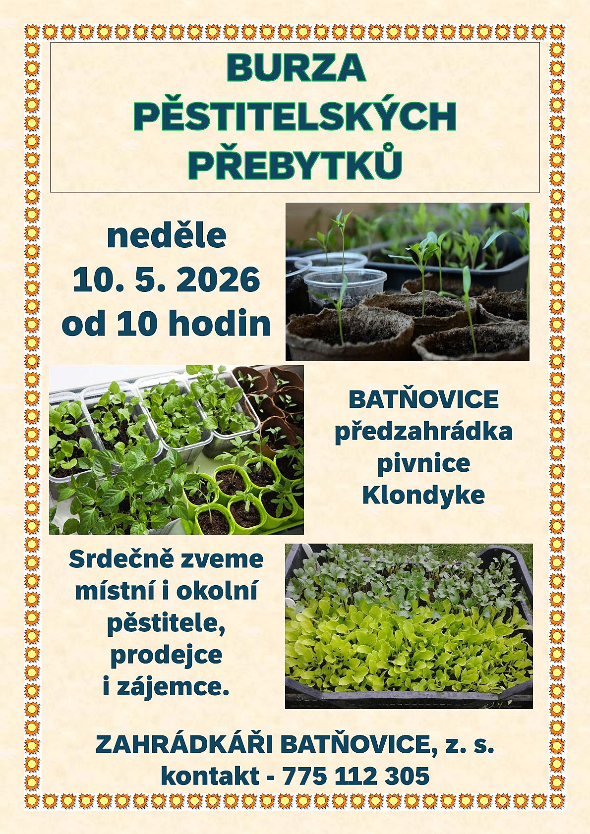 Zahrádkáři z Batňovic pořádají tradiční jarní burzu pěstitelských přebytků. Akce se uskuteční v neděli 10. 5. 2026 od 10 hodin na Klondyke.