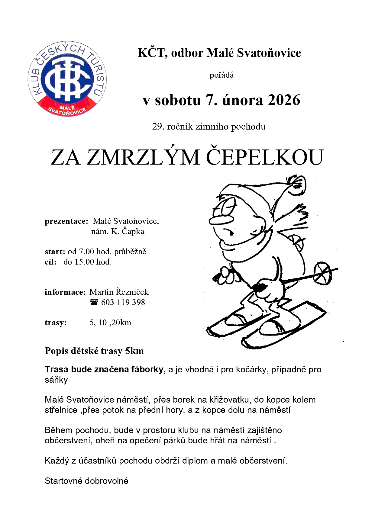 Klub českých turistů Malé Svatoňovice pořádá 29. ročník zimního pochodu Za zmrzlým Čepelkou, v sobotu 7. 2. 2026.