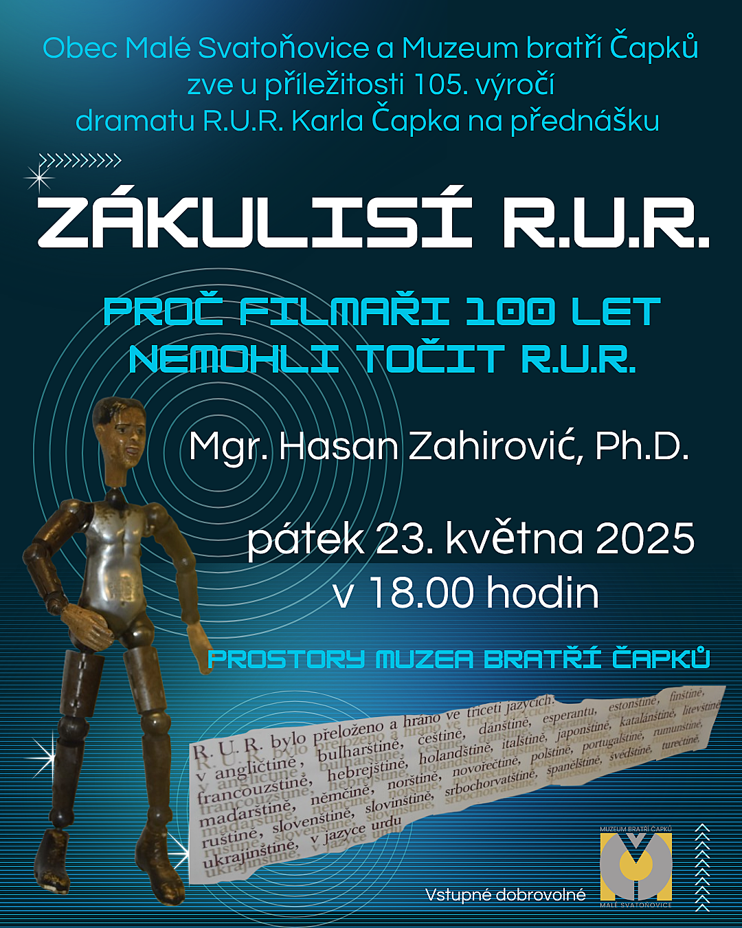 V Muzeu bratří Čapků v Malých Svatoňovicích potom v pátek 23. května proběhne přednáška Hasana Zahiroviče, významného člena Společnosti bratří Čapků, nazvaná "Zákulisí R.U.R.". U této příležitosti se uskuteční i malá exkurze za „robotíkem“, kterého Karel Čapek přivezl z Anglie v roce 1924.
