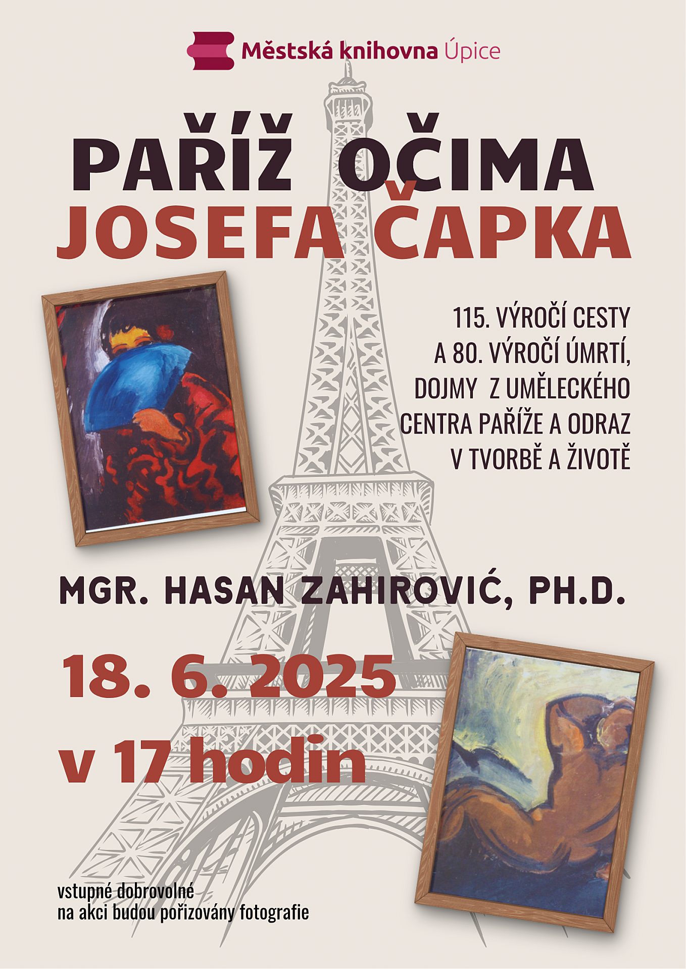 Zajímavý cyklus završí ve středu 18. června pořad nazvaný "Paříž očima Josefa Čapka". V Městské knihovně v Úpici se bude začínat v 17 hodin.