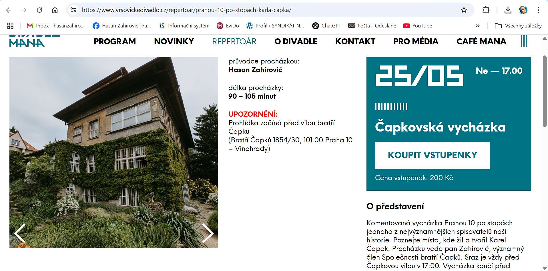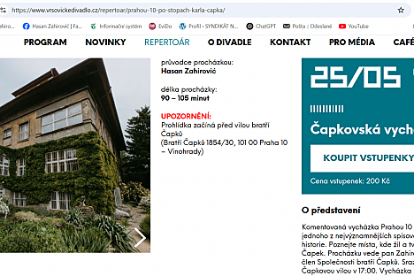 Na komentovanou vycházku Prahou 10 po stopách Karla Čapka se zájemci vydají v neděli 25. května.