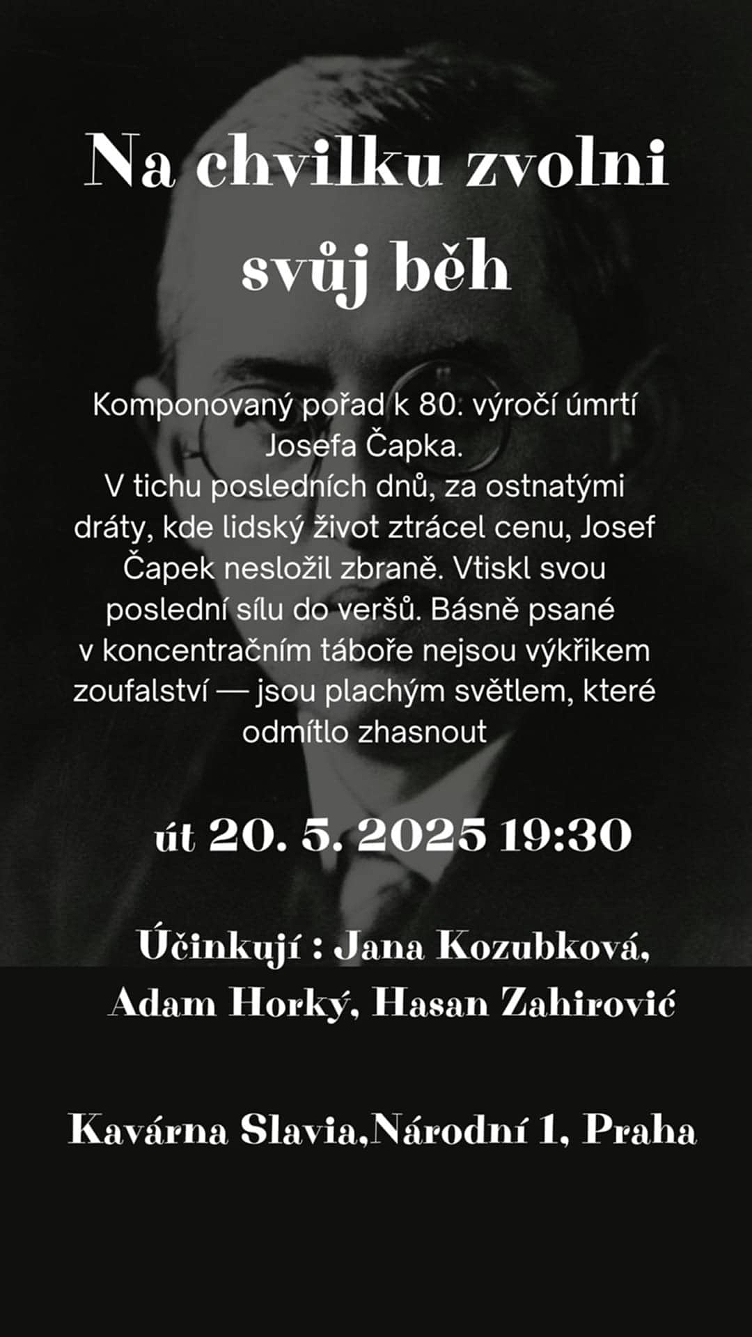 Na chvilku zvolni svůj běh. Tak se jmenuje komponovaný pořad k 80. výročí úmrtí Josefa Čapka, který bude v úterý 20. května hostit pražská kavárna Slavia.