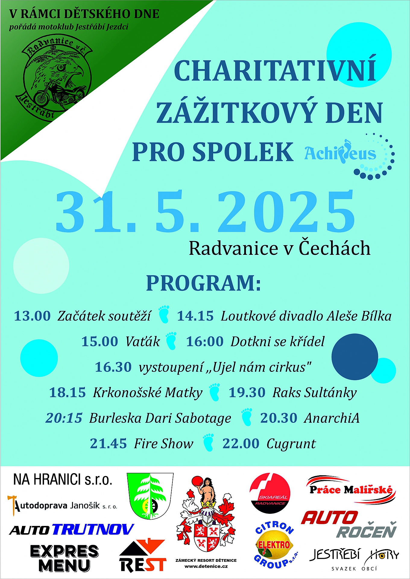 Zážitkový charitativní den pořádá motoklub Jestřábí jezdci Radvanice. V rámci dětského dne proběhne bohatý kulturní program. Děti se můžou těšit na připravené soutěže a obchůdek plný hraček. V doprovodném programu můžete vidět loutkové divadlo, tanečnice ohnivou show a mnoho dalšího. Jsou také připraveny workshopy pro děti i dospělé. Po celý den budou vystupovat kapely a nebude chybět ani skvělé občerstvení.