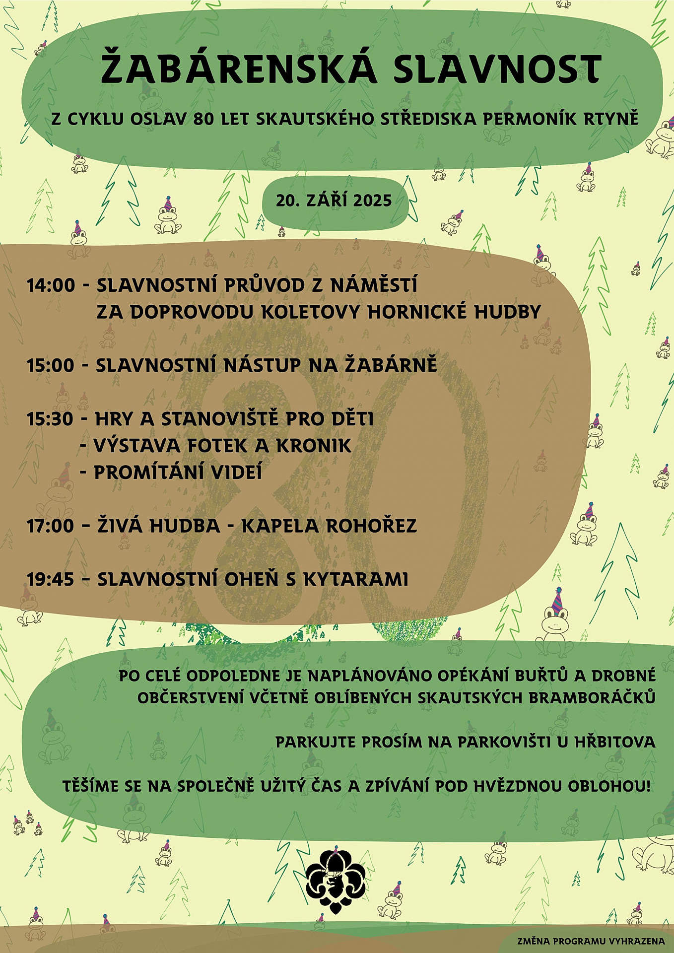 Srdečně vás zveme na Žabárenskou slavnost, která se uskuteční ve Rtyni v Podkrkonoší jako součást cyklu oslav 80 let skautského střediska Permoník!