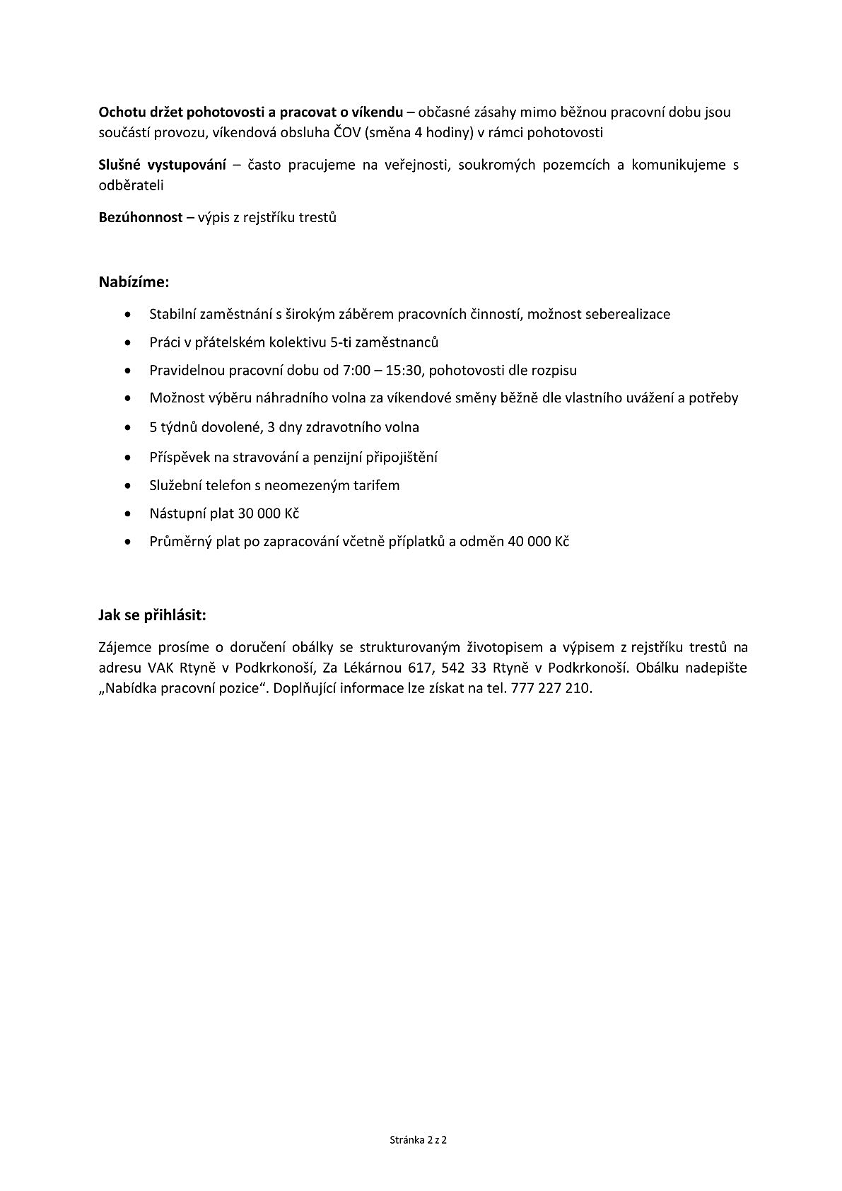 Místo výkonu: Rtyně v Podkrkonoší, nástup možný ihned nebo dle domluvy