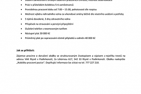 VAK Rtyně v Podkrkonoší přijme pracovníka nebo pracovnici provozu vodovodu a kanalizací.