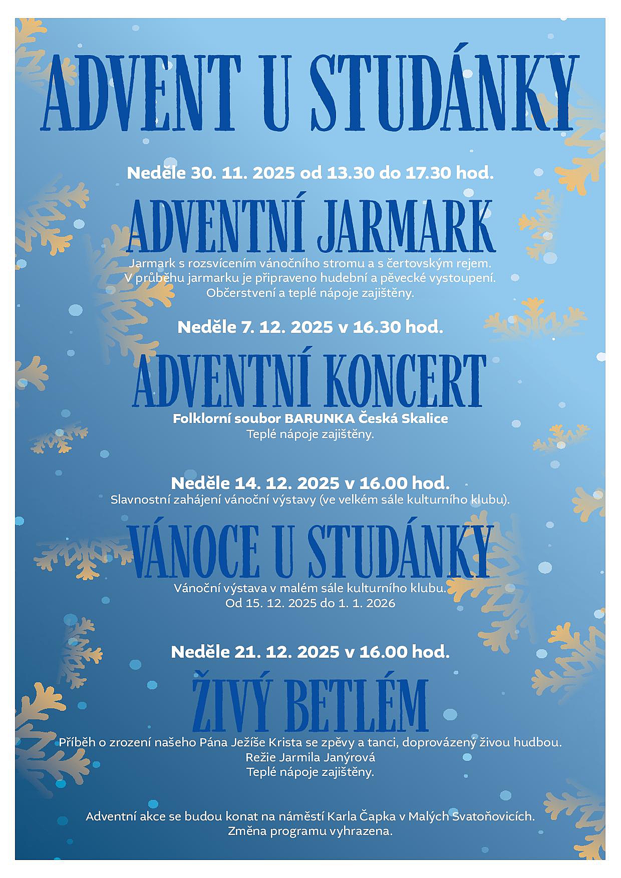 Srdečně vás zveme na tradiční Advent u Studánky – sérii předvánočních akcí, které navodí tu pravou sváteční atmosféru.