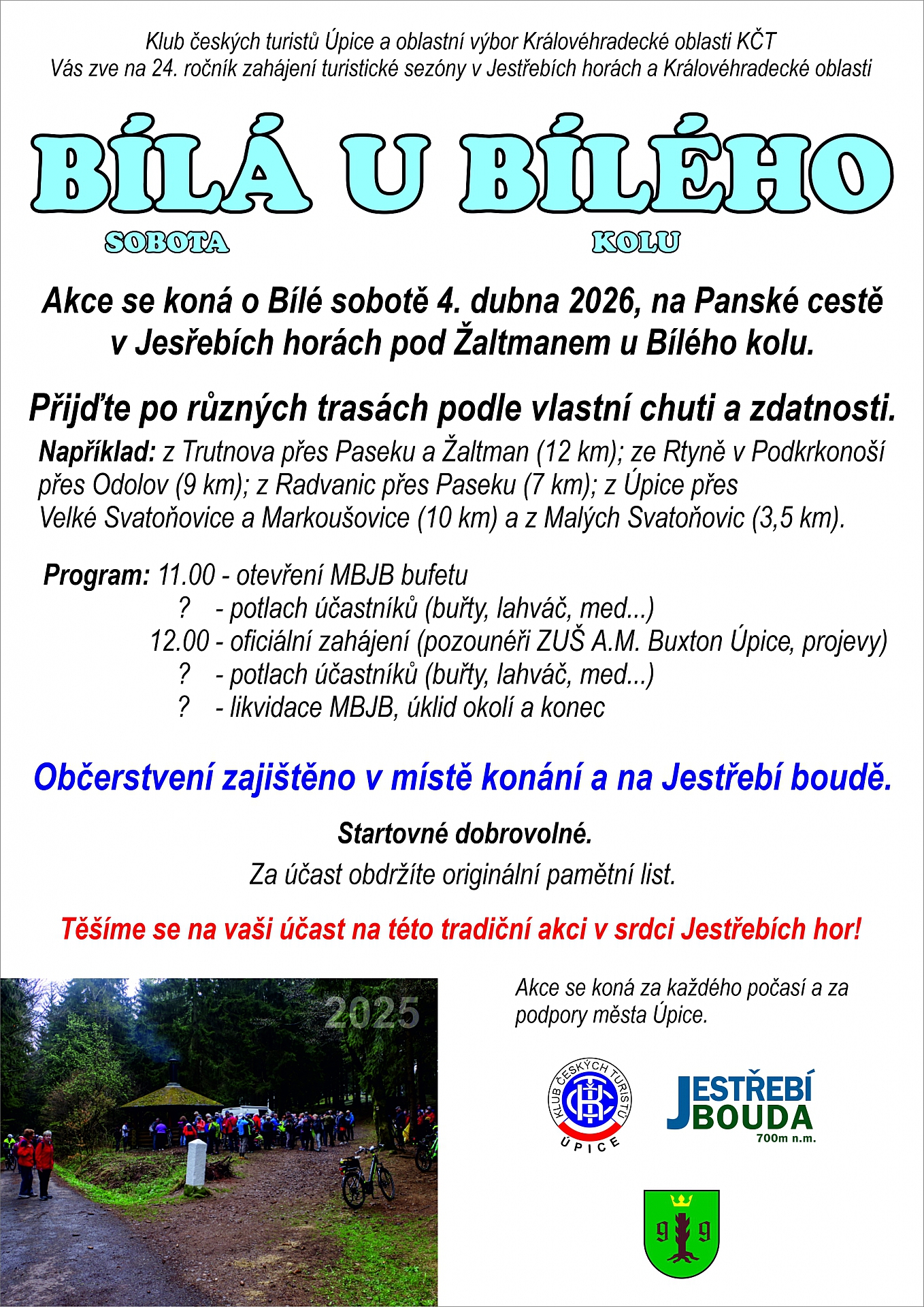 Klub českých turistů Úpice a oblastní výbor Královéhradecké oblasti KČT vás srdečně zvou na tradiční jarní setkání v srdci Jestřebích hor.