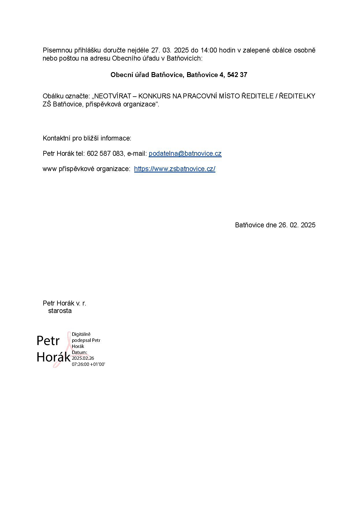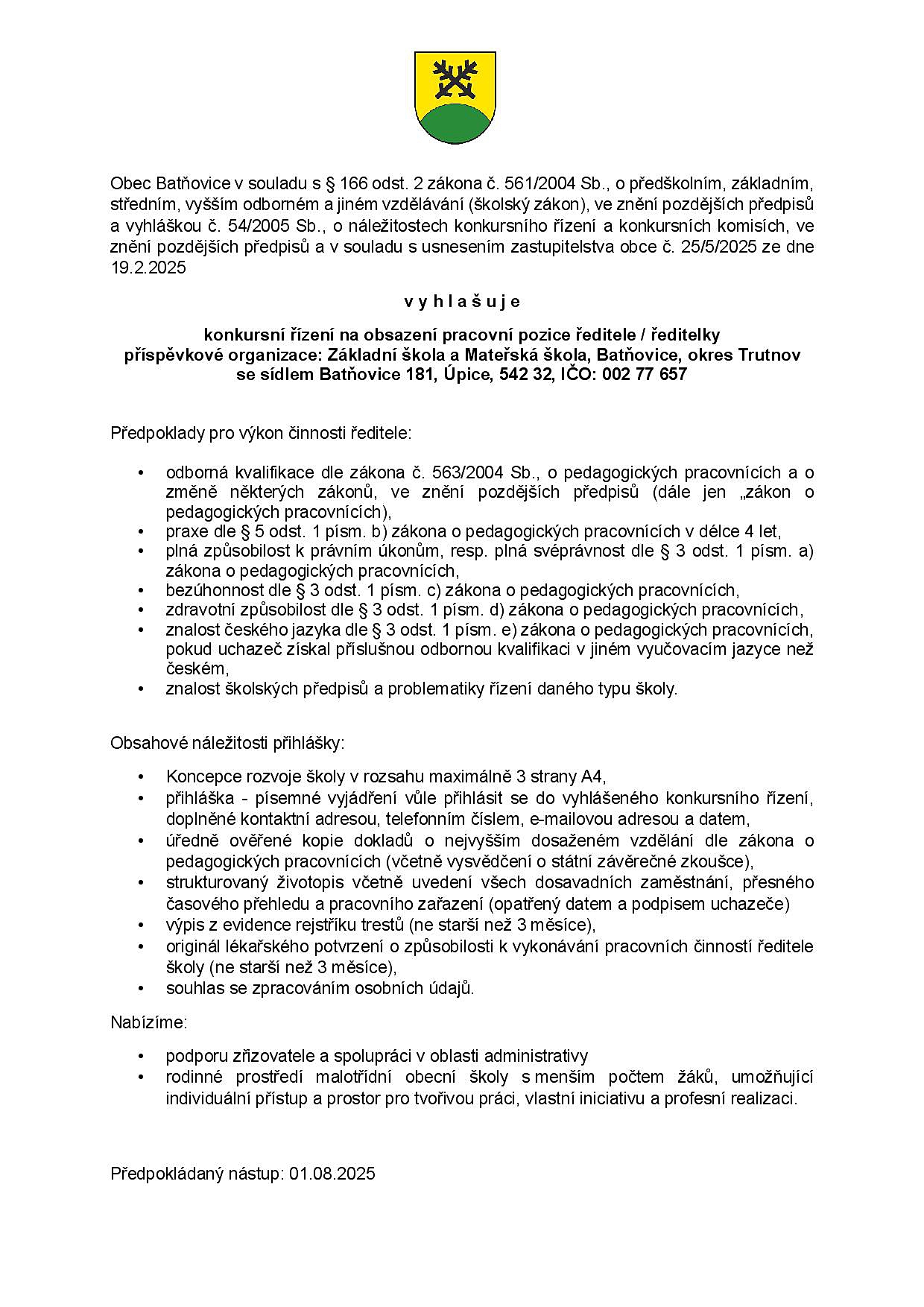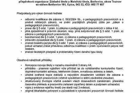 Konkurzní řízení Obec Batňovice vyhlásila konkurz na ředitele/ředitelku Základní a Mateřské školy Batňovice.