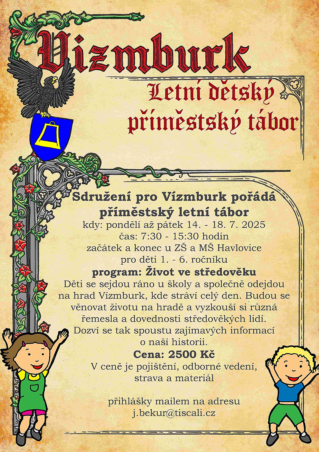 Sdružení pro Vízmburk uspořádá příměstský letní tábor. Uskuteční se od pondělí do pátku 14. - 18. července 2025.