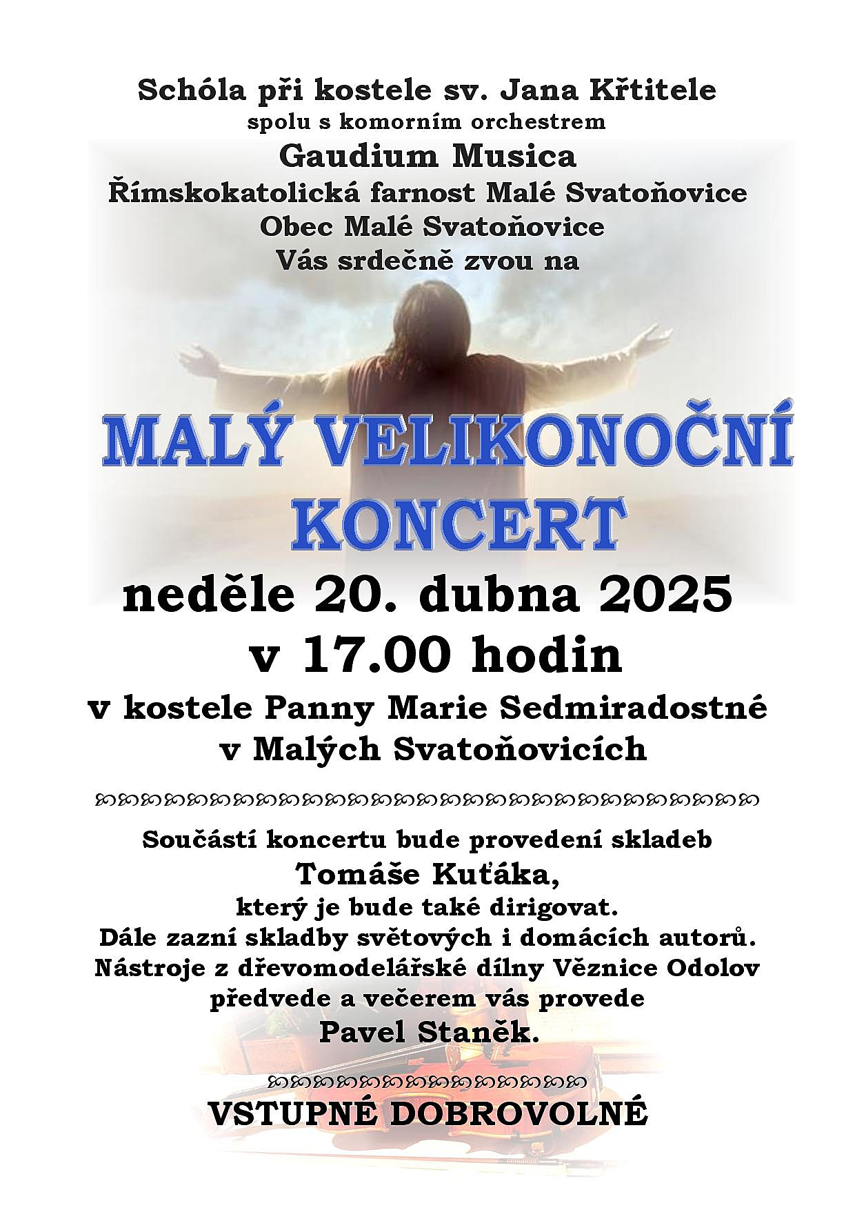 Schóla při kostele sv. Jana Křtitele spolu s komorním orchestrem Gaudium Musica, Římskokatolická farnost Malé Svatoňovice a obec Malé Svatoňovice Vás  srdečně zvou na  MALÝ VELIKONOČNÍ KONCERT.