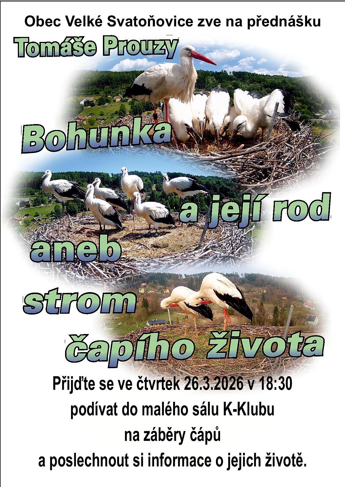 Během přednášky budete mít možnost shlédnout zajímavé záběry čápů a dozvědět se fascinující informace o jejich životě, rodině a každodenních zvycích.