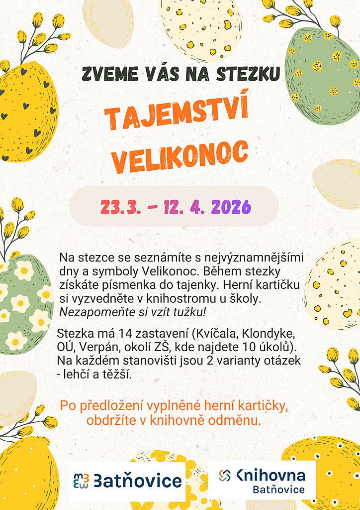 Obec Batňovice a Knihovna Batňovice vás srdečně zvou na tematickou stezku určenou pro děti i dospělé. Přijďte se seznámit s tradicemi a symboly Velikonoc hravou formou přímo v ulicích naší obce.