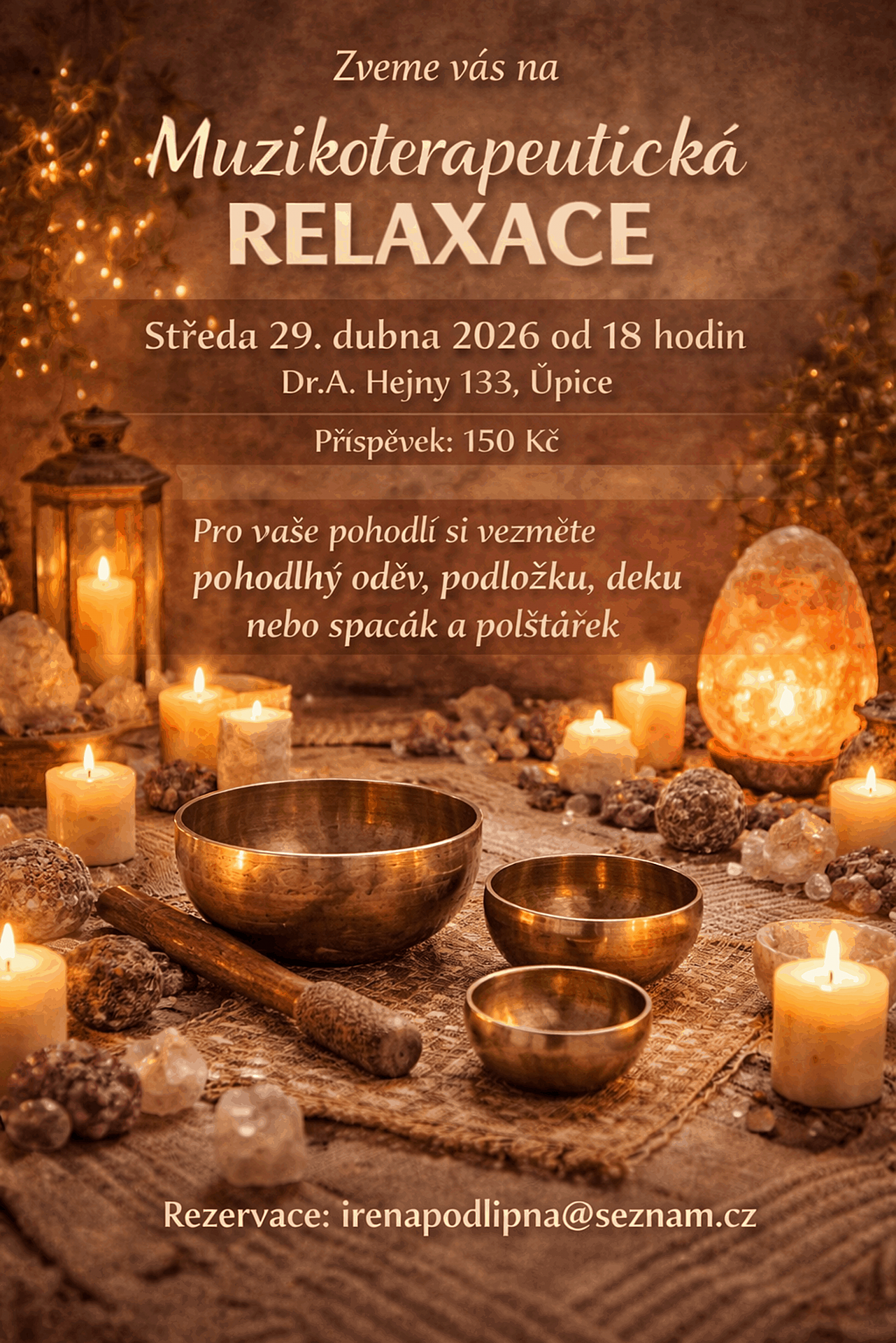 Přijďte si odpočinout na muzikoterapeutickou relaxaci, kde vás jemné vibrace a harmonické tóny přenesou do stavu uvolnění a pohody.