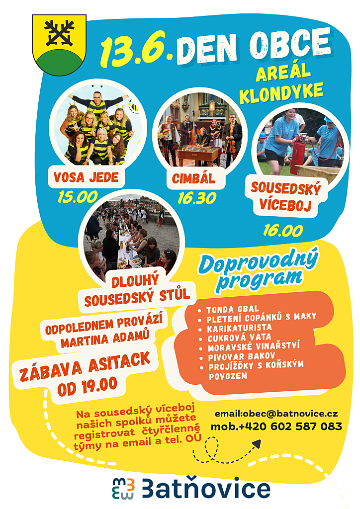 Srdečně Vás zveme na tradiční Den obce Batňovice plný hudby, zábavy a příjemných setkání se sousedy i přáteli. Čeká Vás vystoupení kapely VOSA JEDE, cimbálová muzika, oblíbený sousedský víceboj, program pro děti, občerstvení a mnoho dalšího.