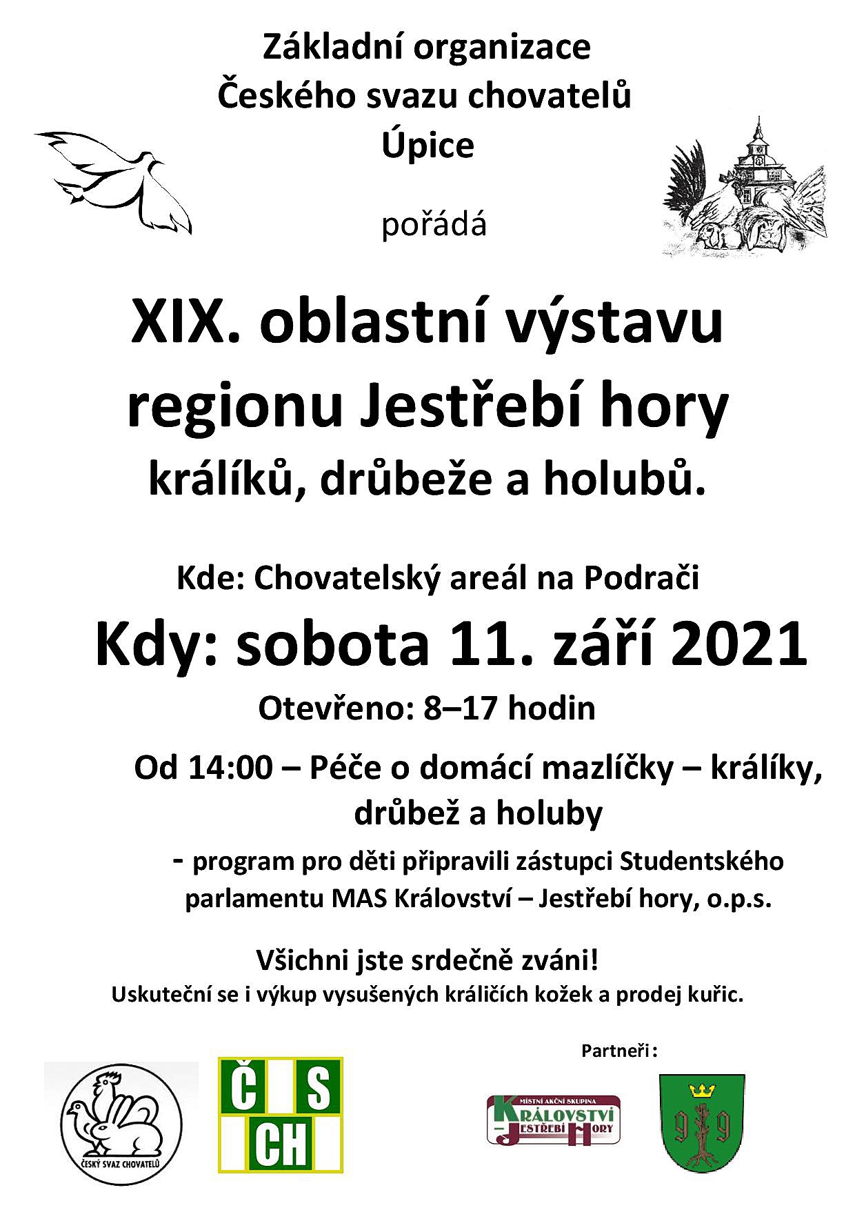 Sobota 11. září 2021 v Úpici na Podrači bude patřit milovníkům domácích zvířat. Proběhne výstava králíků, drůbeže a holubů. Chovatelský areál základní organizace Českého svazu chovatelů ožije od 8 do 17 hodin.Výstavu doplní prodej kuřic, výkup vysušených králičích kožek a nově program pro děti.