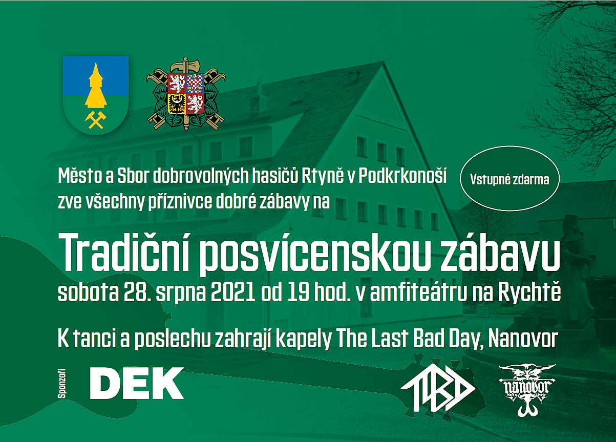 V sobotu 28. srpna 2021 se můžete těšit na Tradiční posvícenskou zábavu ve Rtyni v Podkrkonoší. Bude se konat v amfiteátru na Rychtě a k tanci a poslechu zahrají kapely The Last Bad Day a Nanovor.
