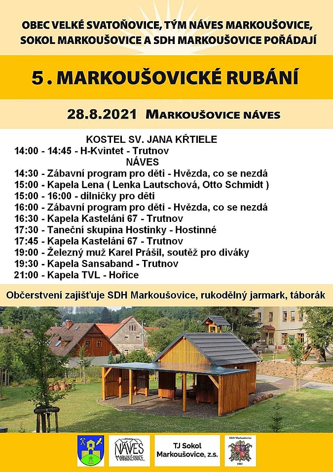 V sobotu 28. srpna se na markoušovické návsi uskuteční již páté Markoušovické rubání. Těšit se můžete na rukodělný jarmark, táborák a v neposlední řadě na spoustu kapel k tanci a poslechu. Občerstvení zajišťuje SDH Markoušovice.