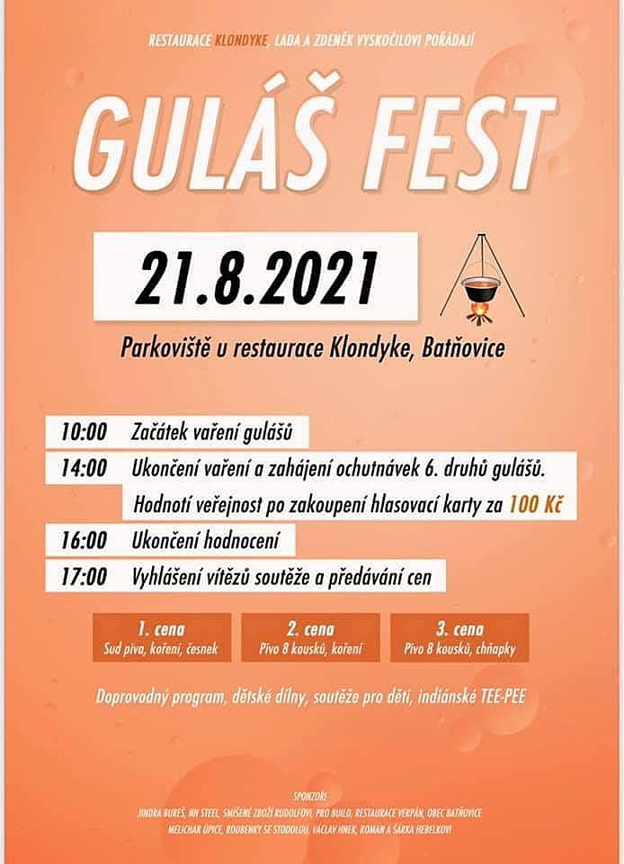 V sobotu 21. srpna 2021 se můžete těšit na oriinální akci s názvem "Guláš fest". Bude se konat u restaurace Klondyke v Batňovicích.