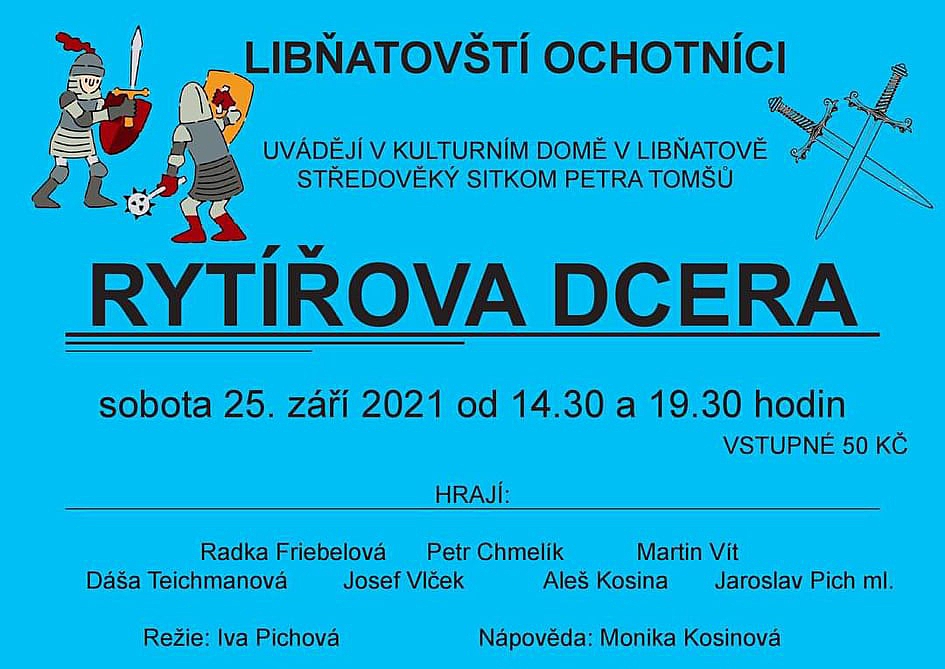 V sobotu 25. září 2021 se můžete těšit na libňatovské ochotníky a jejich představení s názvem Rytířova dcera, které odehrají hned dvakrát a to v 14:30 a v 19:30.