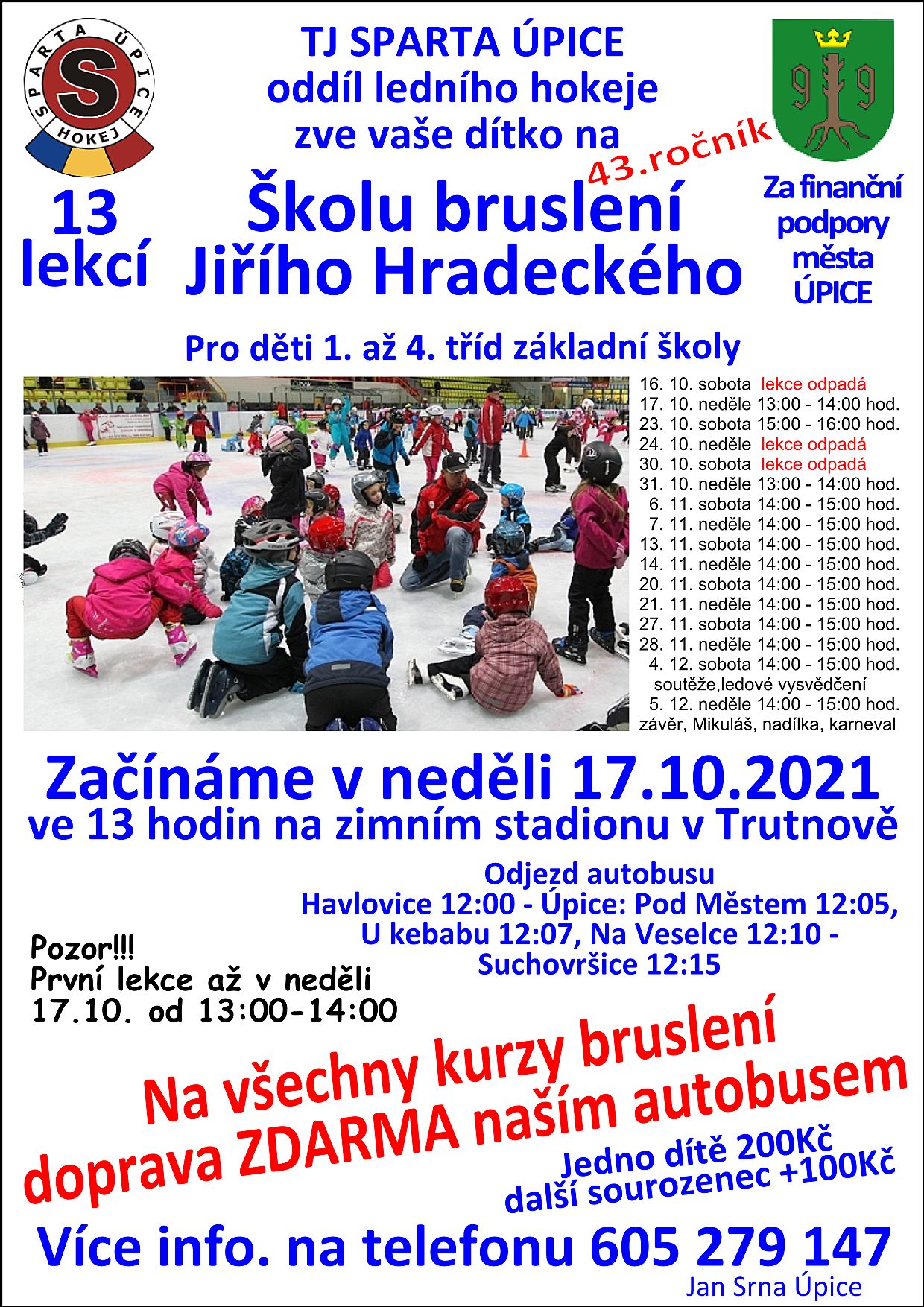 TJ Sparta Úpice, oddíl ledního hokeje, zve vaše dítko na Školu bruslení Jiřího Hradeckého. Akce probíhající za finanční podpory města Úpice je určena pro děti 1. až 4. tříd ZŠ. Začíná se v neděli 17.10.2021 ve 13 hodin na zimním stadionu v Trutnově. Na všechny lekce bruslení je doprava oddílovým autobusem zdarma, vyjíždí se ve 12:00 z Havlovic se zastávkami v Úpici a Suchovršicích.