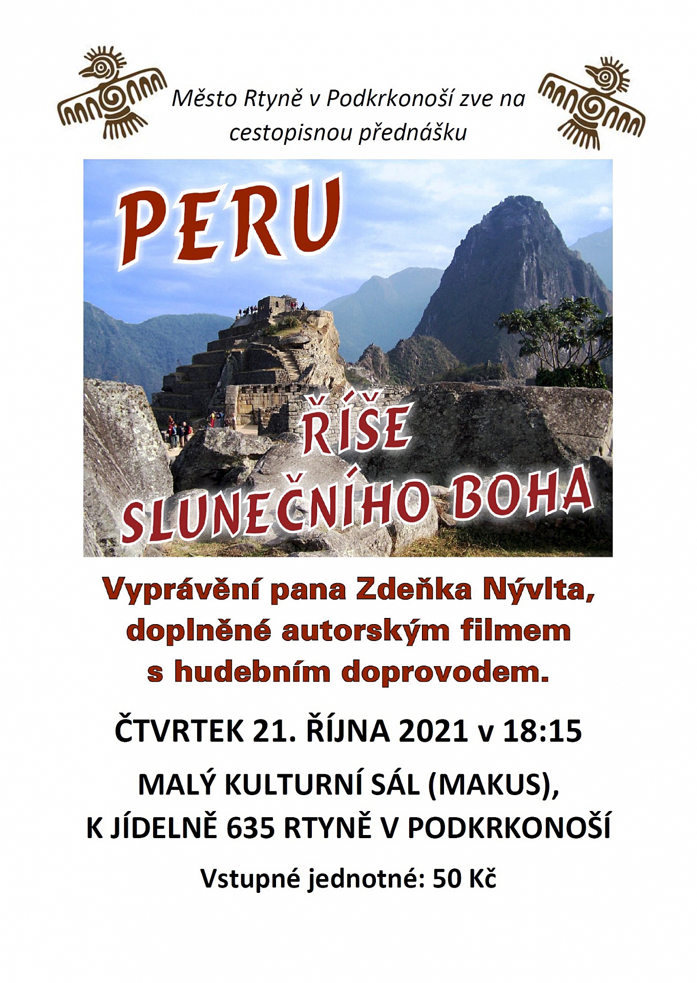 Ve čtvrtek 21. října 2021 se ve Rtyni v Podkrkonoší v malém kulturním sále bude konat cestopisná přednáška pana Zdeňka Nývlta s názvem "Peru - říše slunečního boha".