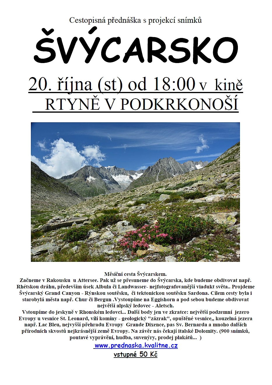Ve středu 20. října 2021 se můžete těšit na cestoupisnou přednášku o Švýcarsku.