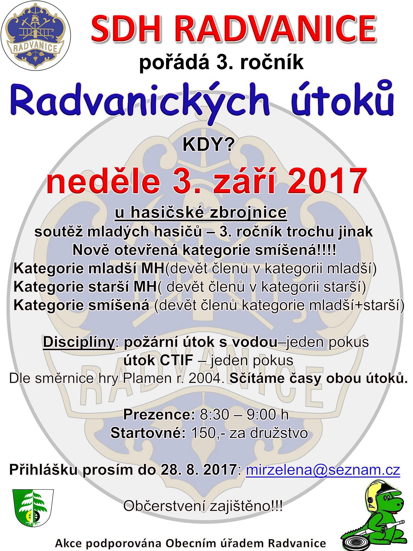 V neděli 3. září se v Radvanicích u hasičské zbrojnice koná 3. ročník soutěže mladých hasičů. Nově byla otevřena smíčená kategorie!