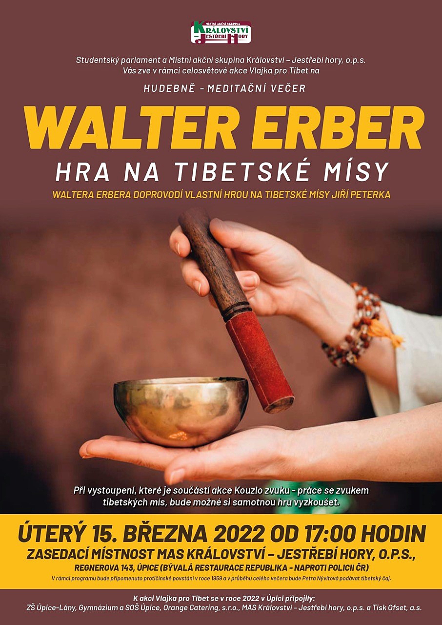 V roce 2022 si při akci Vlajka pro Tibet připomeneme tibetskou kulturu, a to hudebně-meditačním večerem s Walterem Erberem při hře na tibetské mísy. Doprovázet ho bude Jiří Peterka a práci se zvukem tibetských mís si bude možné i vyzkoušet.
