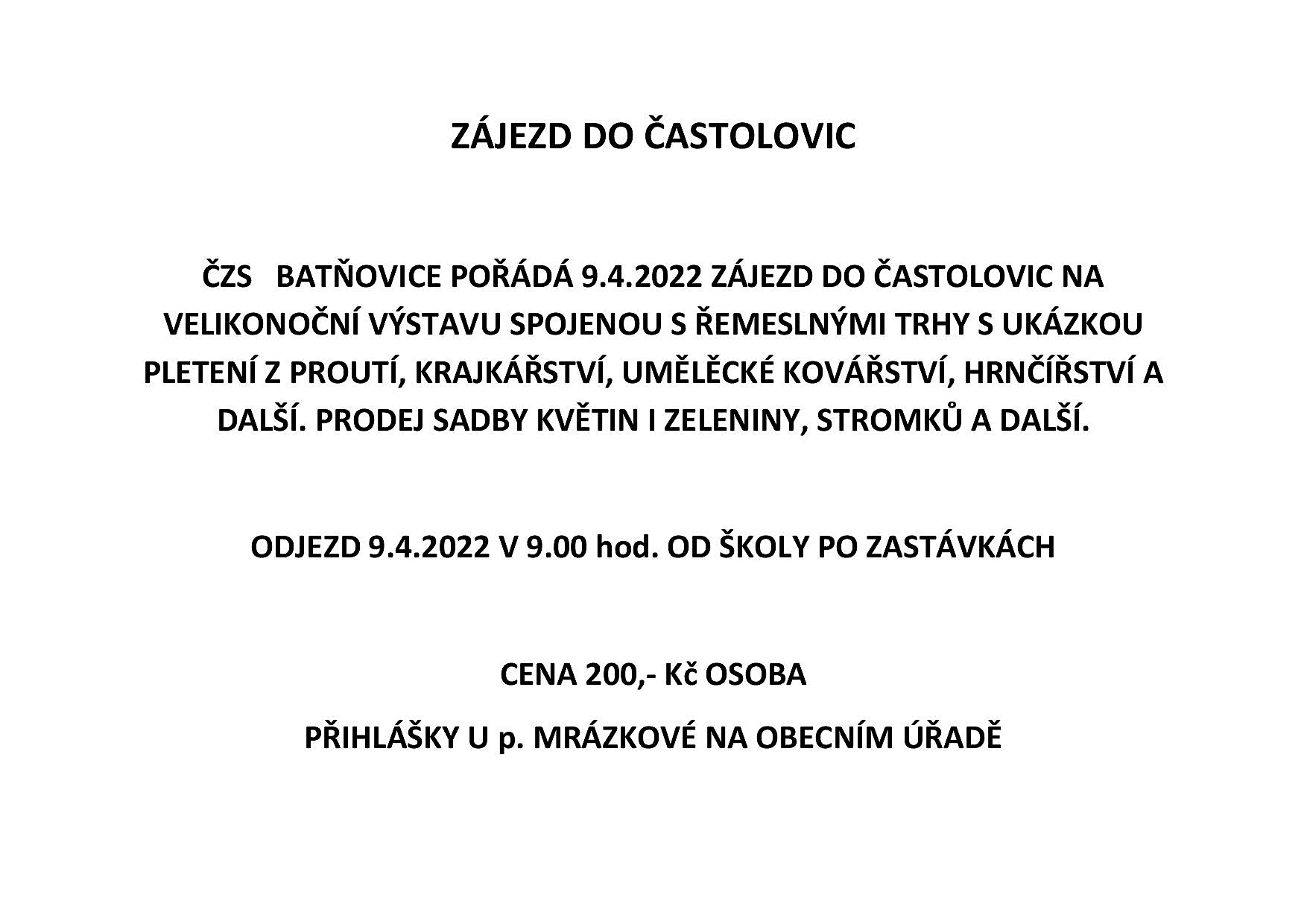 Český zahrádkářský svaz Batňovice pořádá zájezd do Častolovic na Velikonoční výstavu a řemeslné trhy spojené s prodejem sadby a stromků. Termín zájezdu 9. dubna 2022. Cena 200 Kč/osoba Přihlášky na Obecním úřadu u p. Mrázkové.
