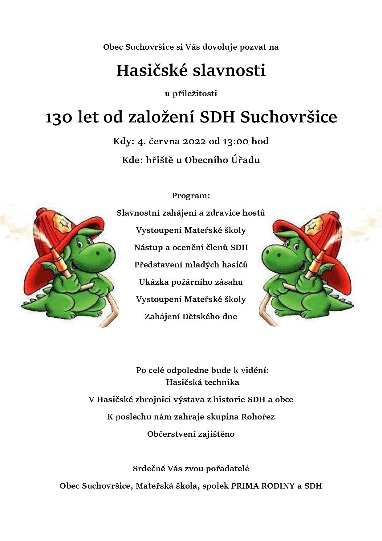 v sobotu 4. 6. 2022 na hřišti u Obecního úřadu v Suchovršicích. Celodenní bohatý program doprovodí hudební skupina ROHOŘEZ.