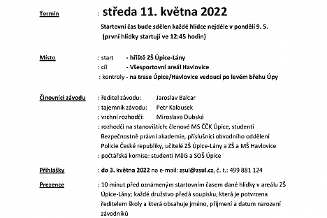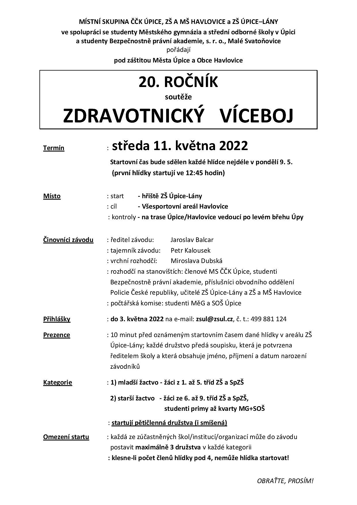 Ve středu 11. 5. 2022 se uskuteční v Úpici soutěž Zdravotnický víceboj. Do soutěže se zapojí hlídky mladších i starších žáků.