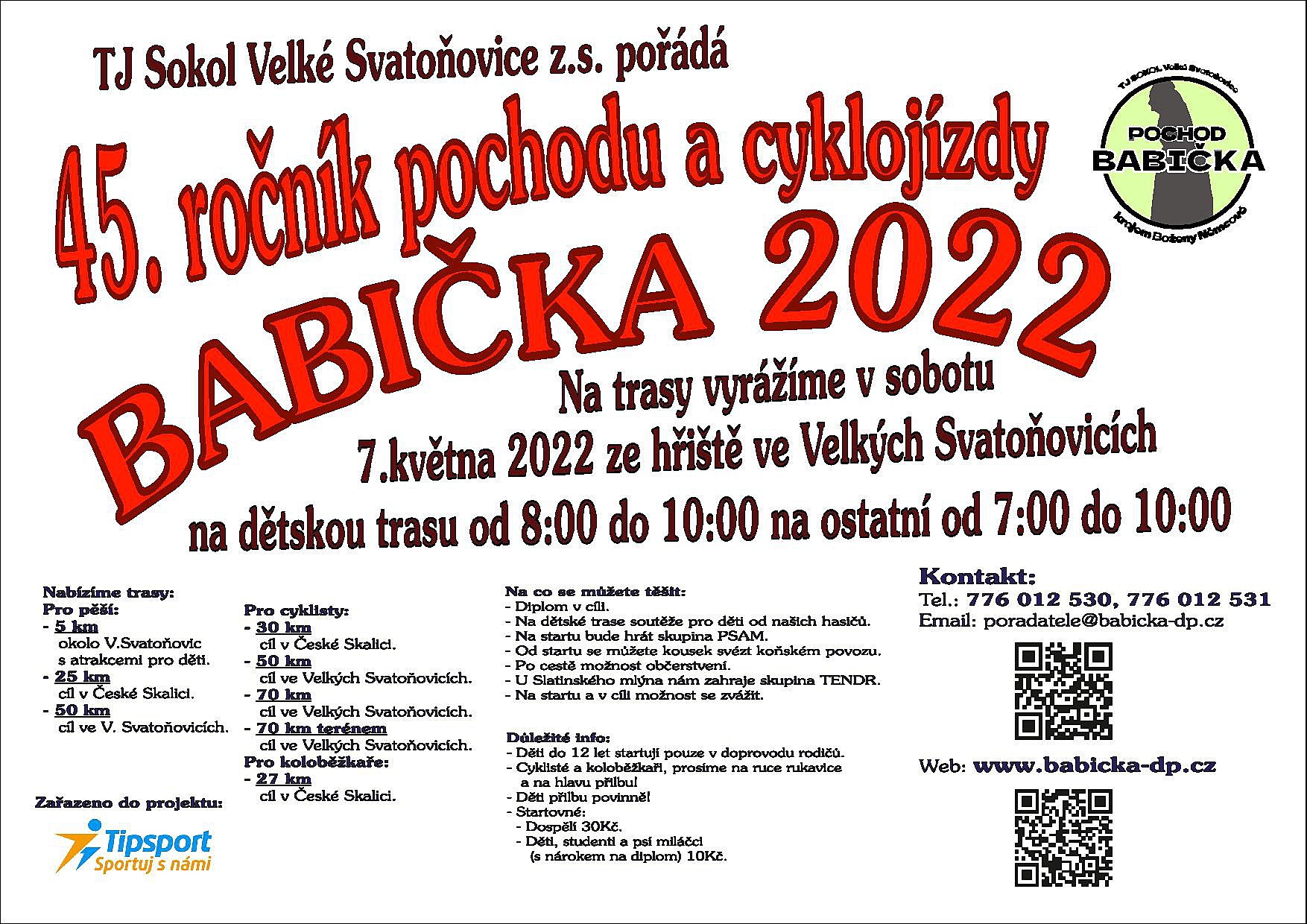 Vyrážíme v sobotu 7. května 2022 ze hřiště ve Velkých Svatoňovicích od 7:00 do 10:00 na dětskou trasu od 8:00 do 10:00