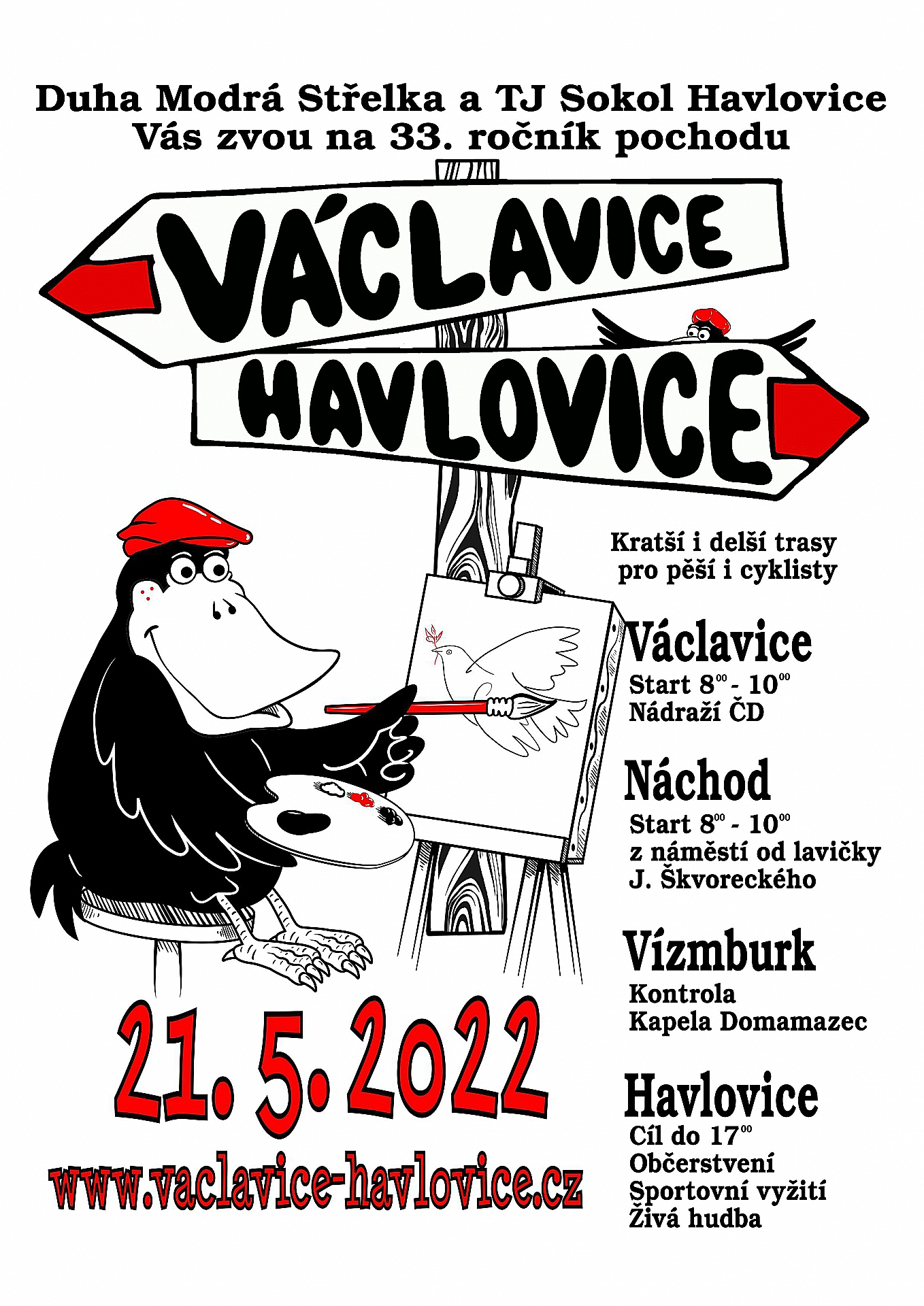 V sobotu 21. 5. 2022 se uskuteční 33. ročník pochodu a cyklojízdy Václavice - Havlovice. Start pochodu bude buď na nádraží ve Václavicích nebo na náměstí v Náchodě u Škvoreckého lavičky od 8 do 10 hodin. Cíl jako vždy ve sportovním areálu v Havlovicích, kde je možnost občerstvení a k poslechu zahraje živá hudba. Na hradě Vízmburk opět zahraje oblíbená kapela Domamazec z Machova. Každý účastník obdrží na startu jednoduchý itinerář s popisem tras, v cíli pak malý diplom. Startovné je dobrovolné. Těší se na Vás pořadatelé z Modré Střelky Náchod a Sokola Havlovice!