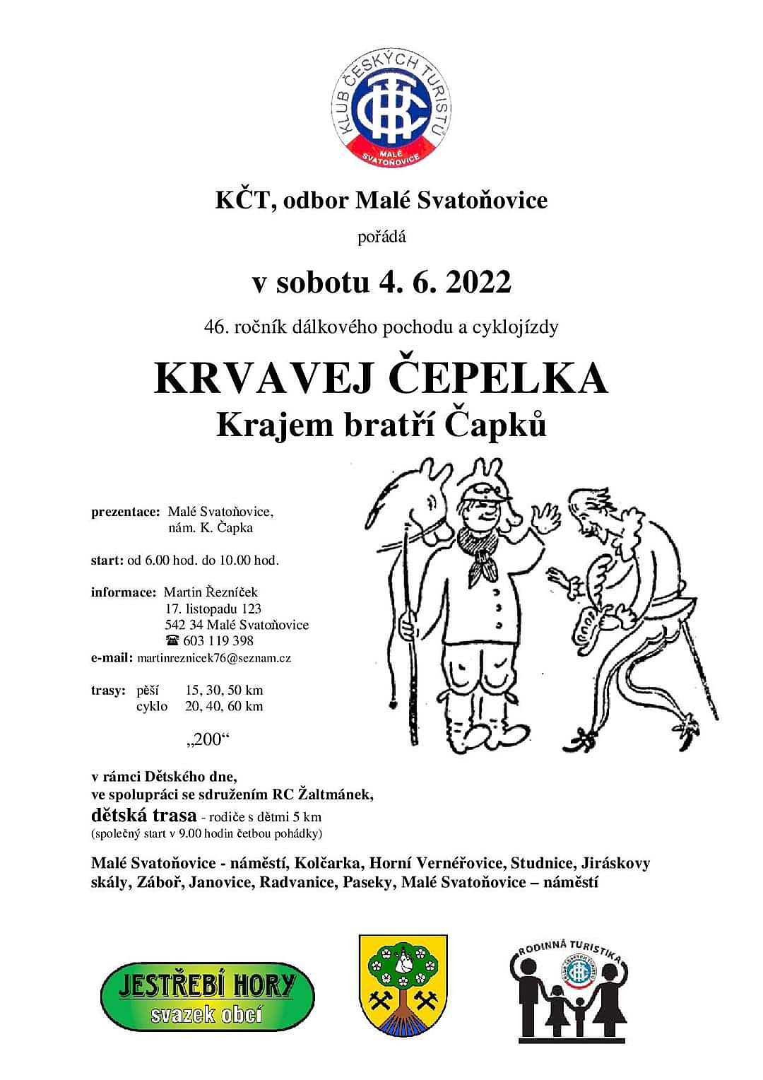 KČT, odbor Malé Svatoňovice zve všechny příznivce turistiky, cyklistiky a dětské turisty na 46. ročník dálkového pochodu a cyklojízdy KRVAVEJ ČEPELKA. Start 6:00–10:00 tradičně na nám. K. Čapka v Malých Svatoňovicích, cíl 17:00.