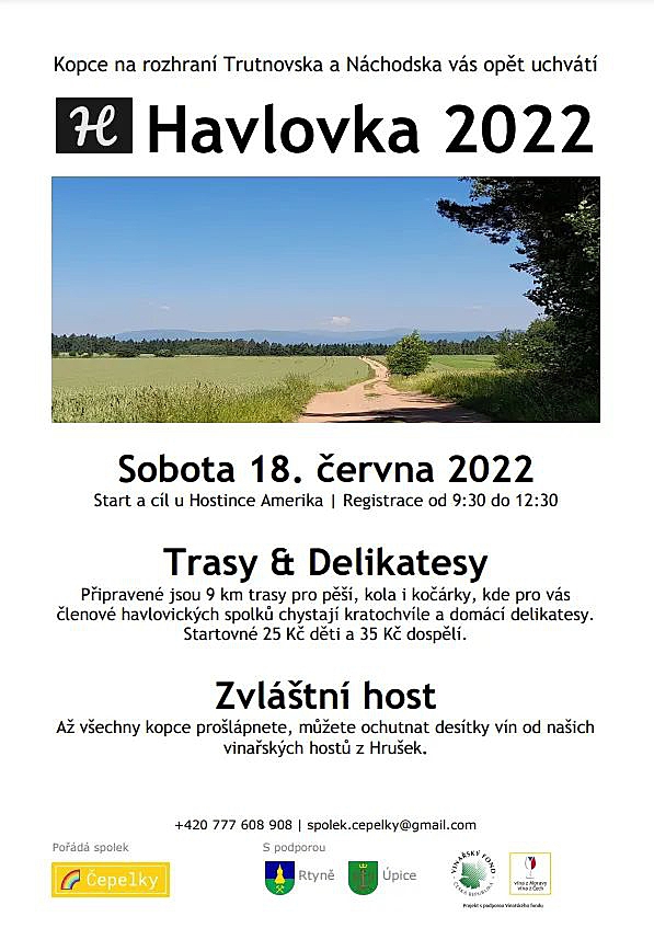 Kopce na rozhraní Trutnovska a Náchodska vás opět uchvátí. V sobotu 18. 6. 2022 od 9:30 do 12:30 hodin, můžete projít trasu, na které vás 6 havlovických spolků přivítá se soutěžemi a občerstvením. Přijďte si udělat hezkou sobotu se svými blízkými, rádi Vás uvidíme, pořadatelé Čepelky z.s.