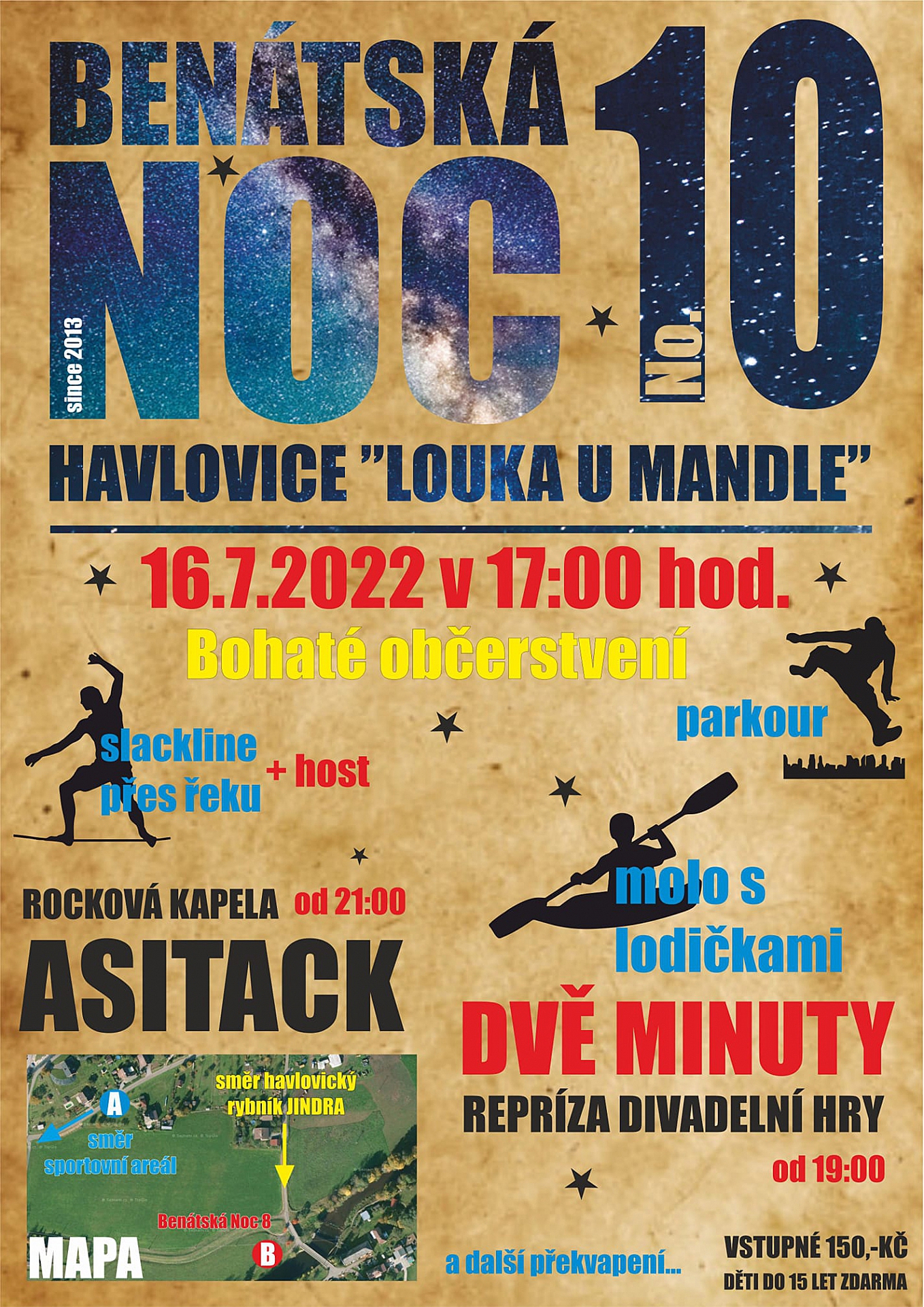 V sobotu 16. 7.  2022 se bude konat v Havlovicích na louce u mandle Benátská noc. Těšit se můžete jak na sportovní a kulturní aktivity, tak i na rockouvou kapelu Asitack.