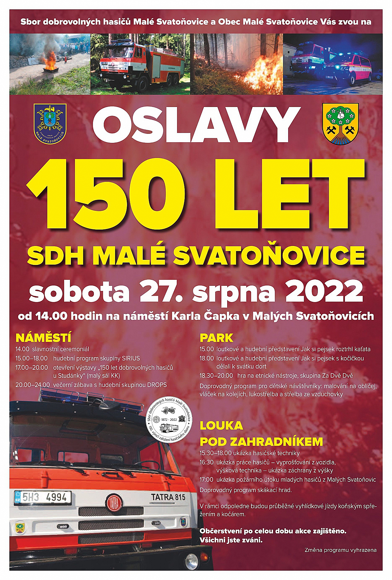 Sbor dobrovolných hasičů Malé Svatoňovice a obec Malé Svatoňovice Vás zvou na OSLAVY 150 LET SDH MALÉ SVATOŇOVICE. Uskuteční se v sobotu 27.08.2022 od 14:00 hodin na náměstí Karla Čapka v Malých Svatoňovicích. Můžete se těšit na zábavné odpoledne pro malé i velké. Podrobný program najdete na přiloženém plakátu. V rámci Oslav budou v sobotu 27.08.2022 od 14.00 do 21.00 hodin uzavřeny vjezdy na náměstí Karla Čapka. Po 21. hodině bude umožněn průjezd náměstím z ulice 9. května do ulice Schejbalova. Děkujeme za pochopení.