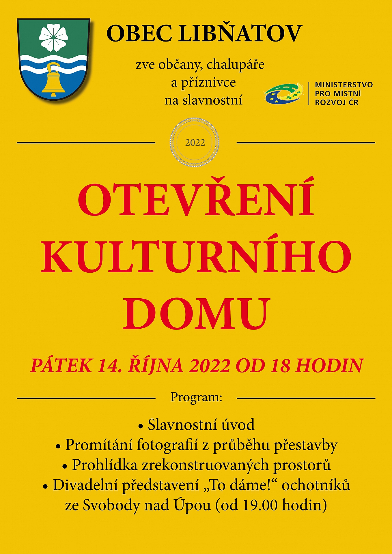 Naplánujte si návštěvu moderně zrekonstruovaných prostorů kulturního domu v Libňatově, na jehož přestavbu významným dílem přispělo Ministerstvo pro místní rozvoj České republiky.