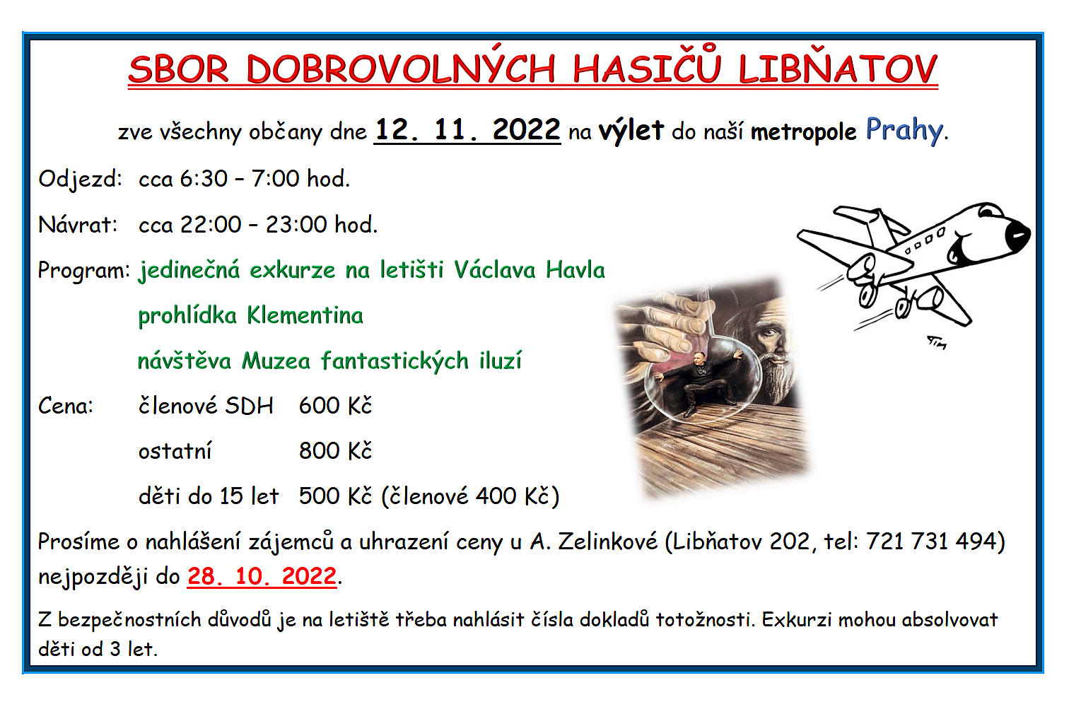 Sbor dobrovolných hasičů Libňatov zve všechny občany dne 12. 11. 2022 na výlet do naší metropole Prahy.