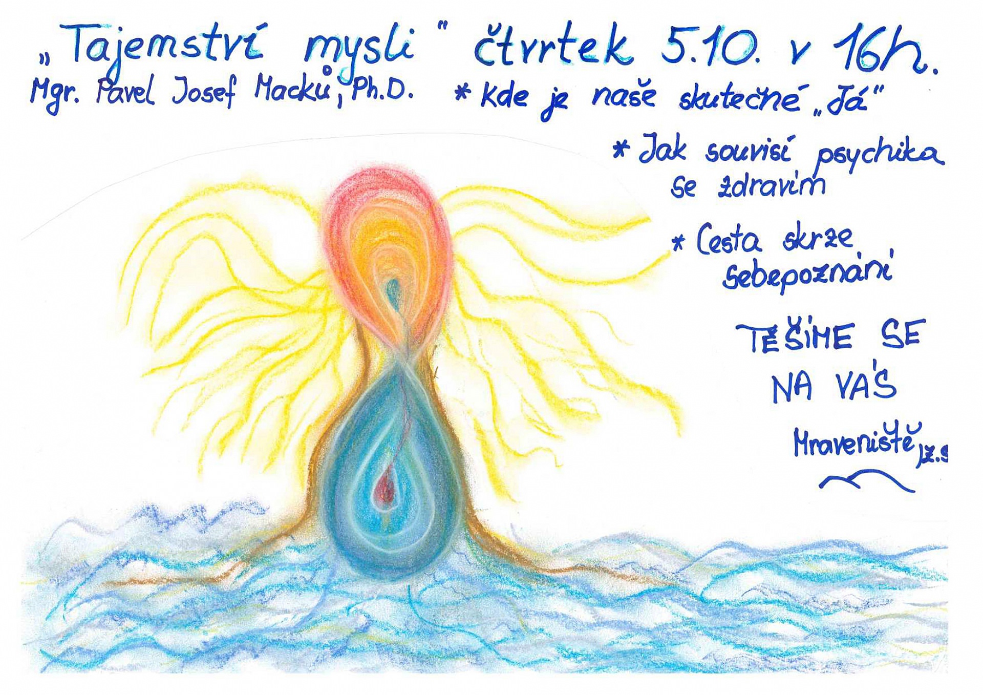 Mraveniště, z. s., pořádá ve čtvrtek přednášku na téma Tajemství mysli. Kde je naše sktečné já? Jak souvisí psychika se zdravím? To vše se dozvíte ve čtvrtek 5. října od 16 hodin v Mraveništi.
