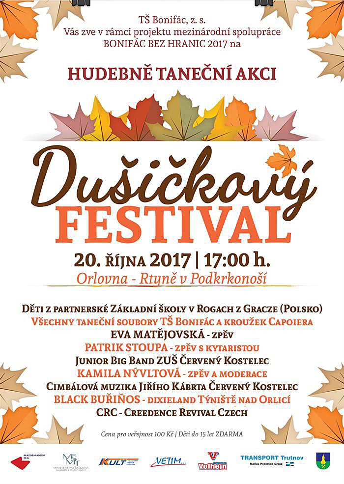 TŠ Bonifác, z.s., zve na hudebně taneční akci Dušičkový festival. Více informací na přiloženém plakátu.