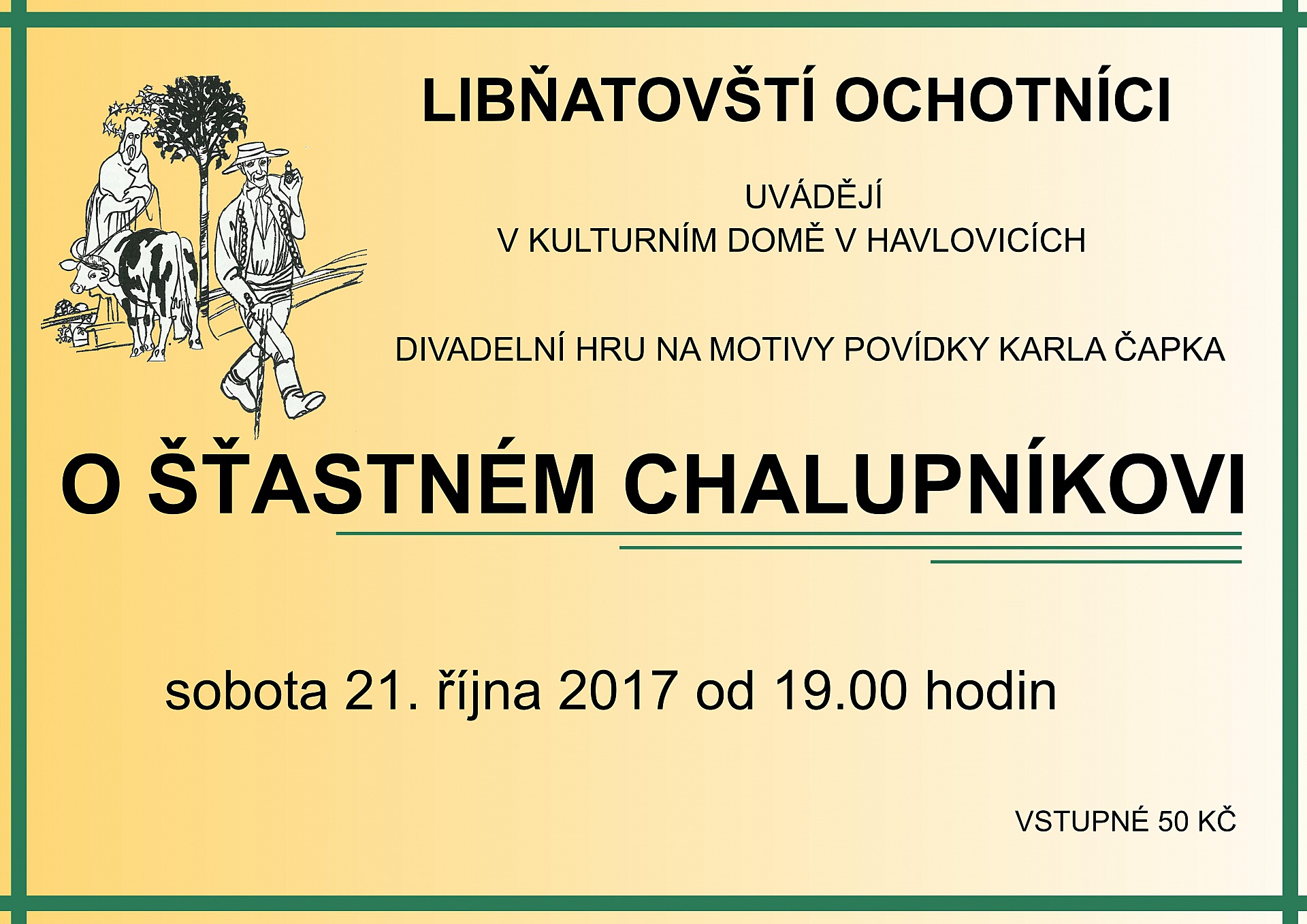 S přicházejícím podzimem se v havlovickém kulturním domě každoročně představují divadelní ochotníci z okolních měst a obcí. Tentokrát se v Havlovicích představí libňatovští ochotníci s divadelní hrou O šťastném chalupníkovi. Na jejich vystoupení Vás zveme v sobotu 21. října 2017 od 19 hodin. Vstupné je 50 Kč.
