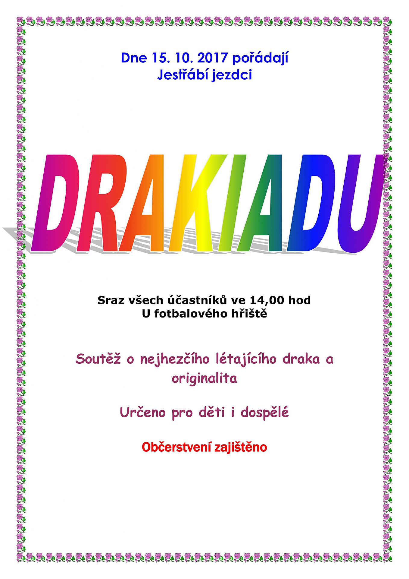 Jestřábí jezdci, z.s., pořádají v neděli 15. 10. 2017 tradiční DRAKIÁDU. Sraz účastníků bude u fotbalového hřiště ve 14:00 hod.