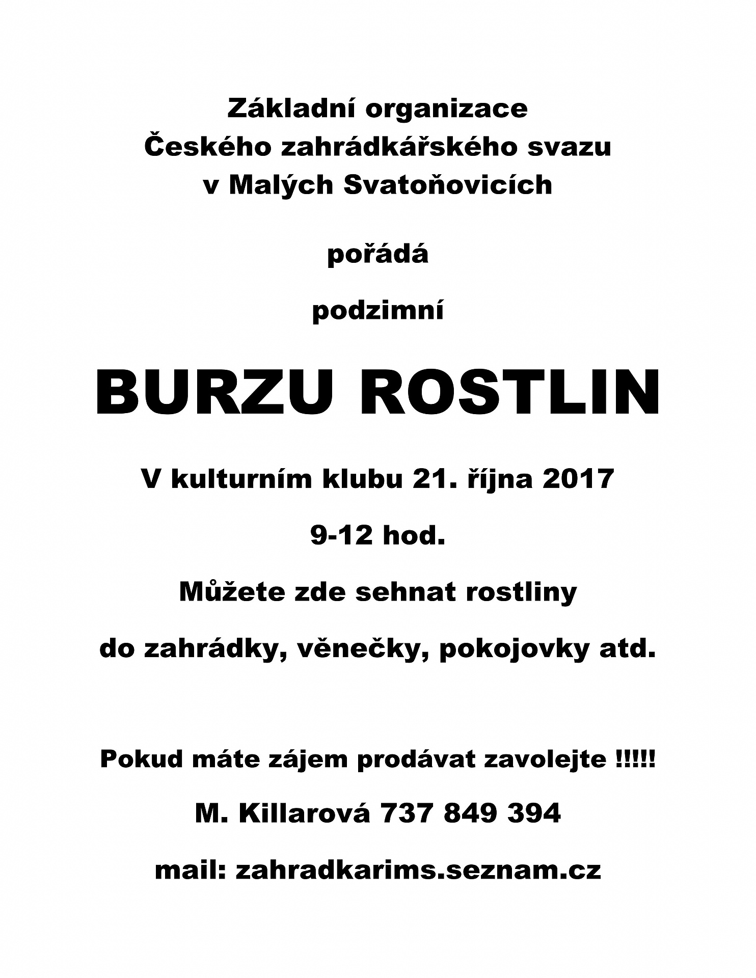 Základní organizace Českého zahrádkářského svazu v Malých Svatoňovicích pořádá podzimní Burzu rostlin. Burza se uskuteční v sobotu 21. října od 9 do 12 hodin v Kulturním klubu v Malých Svatoňovicích.