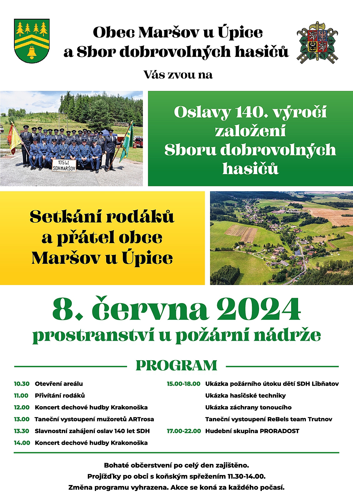 Srdečně vás zveme na oslavy 140. výročí založení SDH a s nimi spojené setkání rodáků, občanů a přátel Maršova u Úpice.